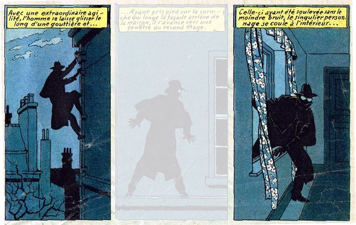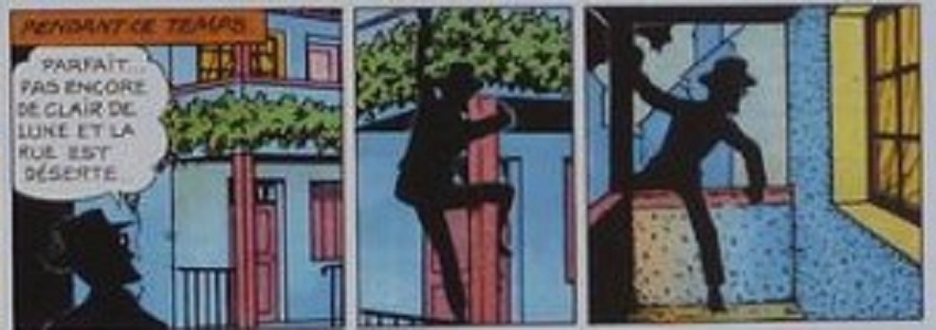 Dans les deux cas, on a une traînée lumineuse quasi surnaturelle, en partie cachée à "nos" regards par des arbres qui ressemblent à des pins et se découpent sur un ciel sombre ; des héros stupéfaits - au bord d'une balustrade - ; un élément d'architecture pittoresque à gauche de la vignette...
