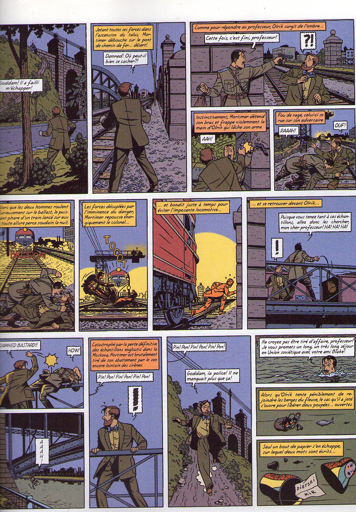 Mortimer évite le train , se redresse , voit Olrik en face de lui ( il y a beaucoup d'espace entre la voie ferrée et les rambarde du pont ) , lui colle un bon coup de poing et l'envoie dans la rivière !