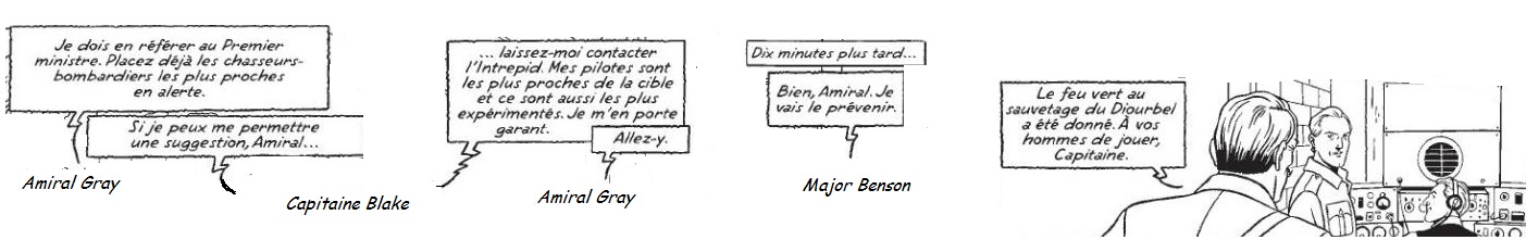Hors dans les vignettes suivantes on devine qu'il est parti réfléchir dix minutes dans son bureau avant de téléphoner au Major qui prévient le commandant du Porte-Avions .
