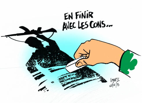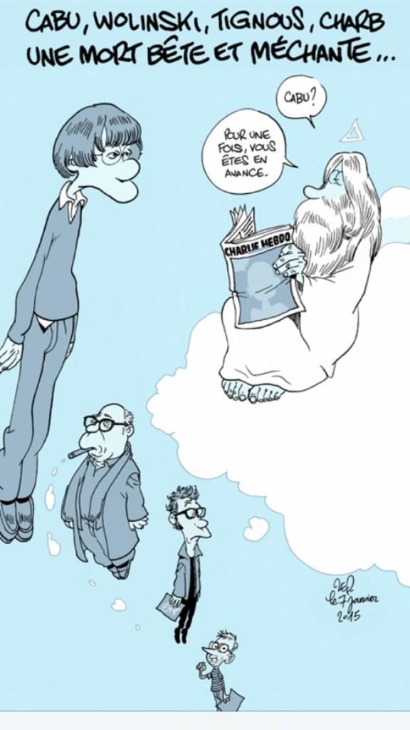 J'espère voir plein de caricatures irrévérencieuses de Charlie et quand même rire un peu : ne sombrons pas non plus dans le trop plein de symbolisme qui est à mille lieues de l'esprit Charlie, comme l'a très bien rappelé Luz dans une interview aux Inrockuptibles (à ce titre, le dessin avec le doigt d'honneur est particulièrement bien senti). Pour ce qui est de l'hommage qui les concerne en tout cas ; ils n'ont malheureusement pas été les seules victimes de ces attentats immondes.