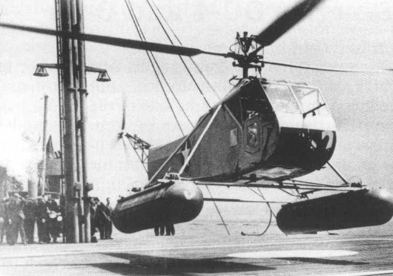 Nous avons en effet affaire à un hélicoptère Bell 47 de 1946, équipé de coussins en caoutchouc gonflables dans sa version « rescue », descendant du premier hélicoptère qui fut équipé de tels coussins, le Sikorsky XR-4 de 1943 que l’on voit ici lors de ses premiers essais, atterrissant sur le pont d'un contre-torpilleur et sur moins de 20m² : -- De mon côté, lorsque j’ai écrit les Secrets de l’Espadon, et en dépit de ma base de données aéronautique assez conséquente, je n’avais pas réussi à « mettre un nom » avéré et vérifié sur le type d’hélicoptère embarqué à bord des sous-marins de « B.S. », contentant de présenter alors ses deux « cousins » les plus proches : le Fairey Jet « Gyrodine » Model 2C de 1952, pour ses ailerons arrière, et le Kellett « XR-8 », pour sa voilure double… - Je m’étais certes approché, mais en étais encore assez éloigné. Jusqu’à aujourd’hui…