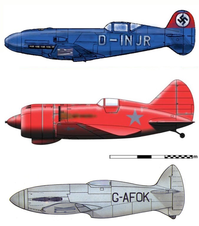 C’est bien là que j’ai finalement trouvé les modèles d’appareils sur lesquels Jacobs aurait effectivement pu se « pencher » sur des articles dans les revues qu’il lisait régulièrement, en la « personne » du Polikarpov I-180-M3-MB2 de 1938, issu du Polikarpov I-16, du Messerschmitt 209 de 1939 et du Napier-Heston J5 de 1936, qui présentait véritablement une « gueule » de squale… même si aucun des trois ne possède à, part entière tous les attributs propres au « Requin ».