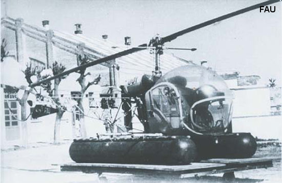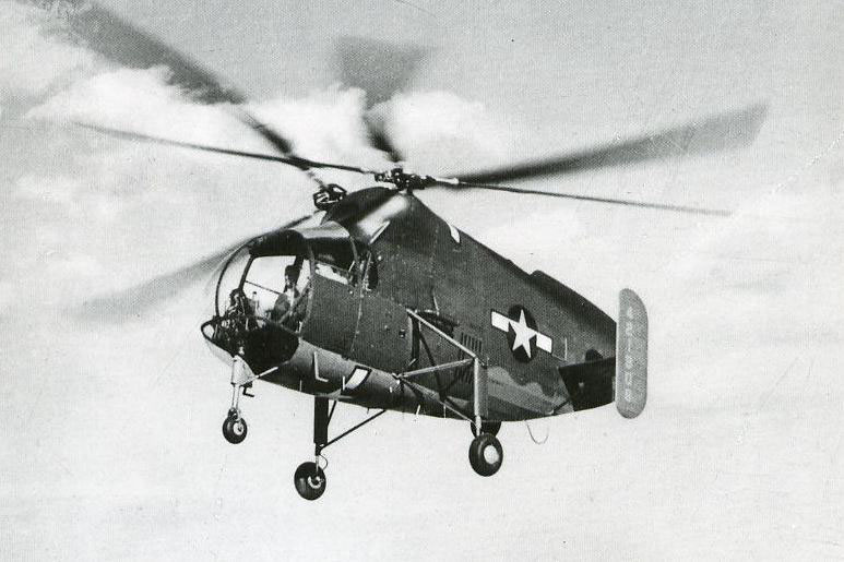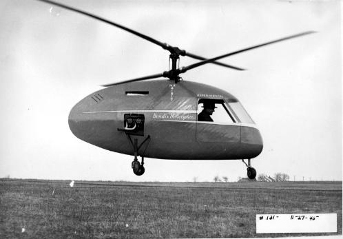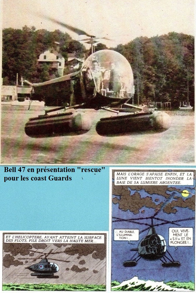 Nous avons en effet affaire à un hélicoptère Bell 47 de 1946, équipé de coussins en caoutchouc gonflables dans sa version « rescue », descendant du premier hélicoptère qui fut équipé de tels coussins, le Sikorsky XR-4 de 1943 que l’on voit ici lors de ses premiers essais, atterrissant sur le pont d'un contre-torpilleur et sur moins de 20m² :
