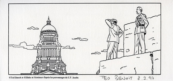 Je viens de retomber sur ce dessin de Ted Benoit; hasard ou pas peu importe, mais troublante similitude avec le projet du "Dernier Pharaon" (B & M + palais de justice de bruxelles + pyramide) :