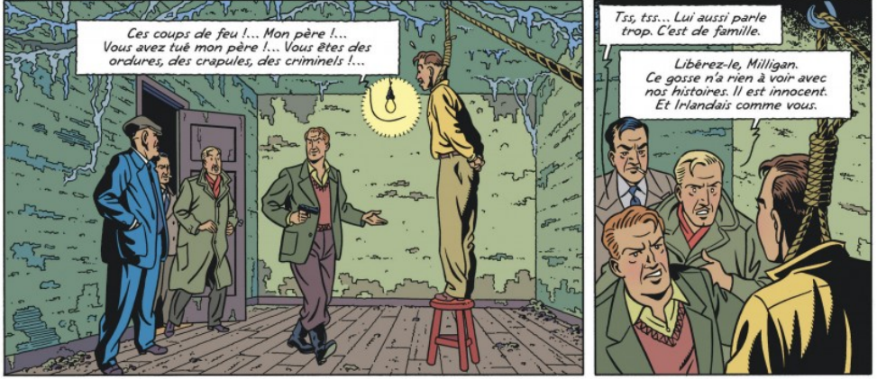 L’erreur page 16/18 du dernier espadon a déjà été soulignée? Blake explique page 18 au jeune irlandais qu’il doit couper la corde au dessus de sa tête alors qu’il pourrait le faire peinard vu que page 16 on voit que la corde n’est pas accrochée au plafond mais juste passée dans un anneau qui va chercher à mi hauteur du mur.