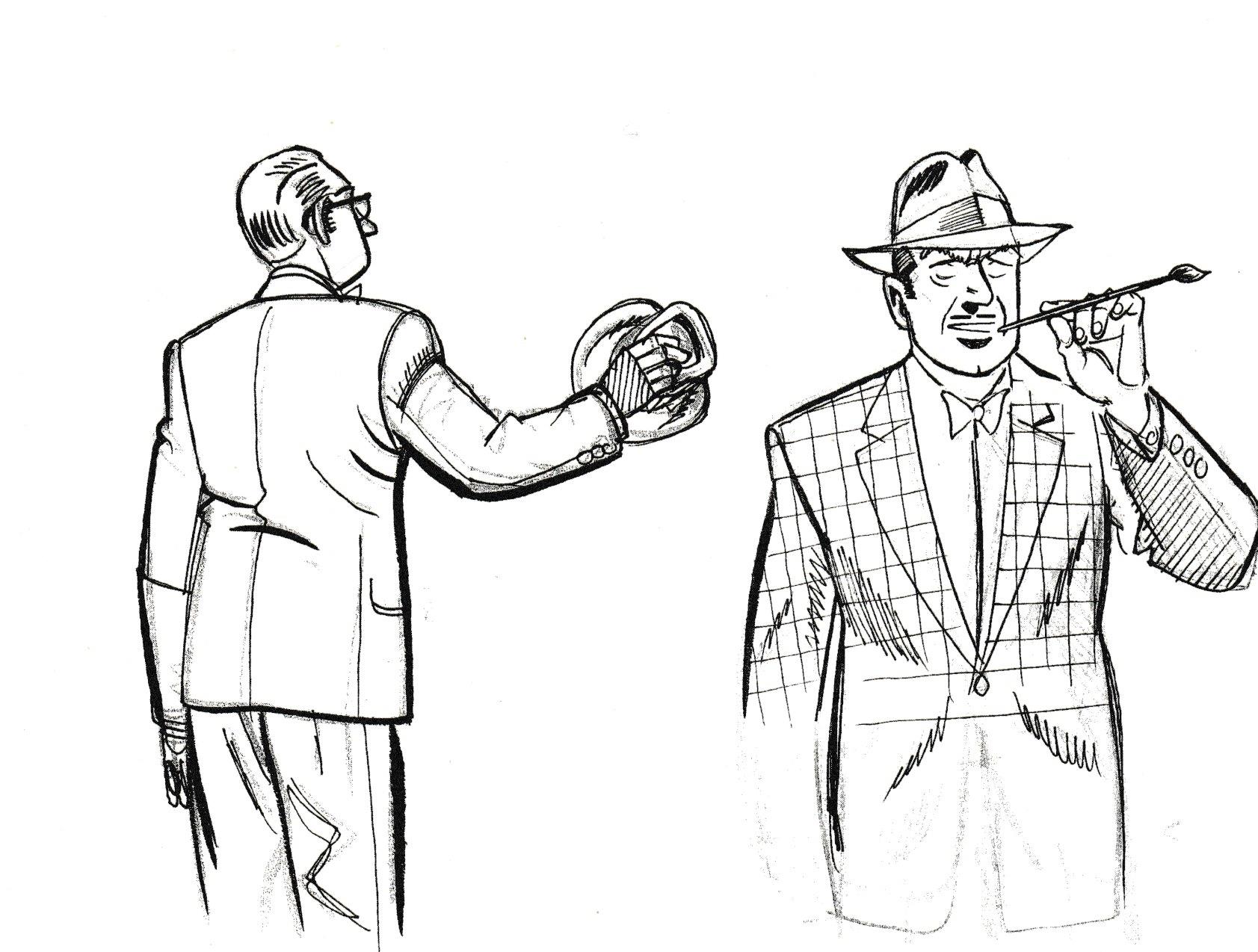 Edgar P. Jacobs : Le Rêveur d'apocalypses, planche n°10 à l'encre de Chine et au feutre sur fond d'impression bleu publiée dans le tirage de luxe de cet album aux Editions Glénat en 2021 (planche inédite dans la version courante de l'album). Eté 1955, l'artiste vient d'emménager dans sa nouvelle demeure au "Bois des Pauvres" à Lasne. Les cartons de déménagement sont encore éparpillés sur le sol du rez-de-chaussée mais le piano est intact, c'est le principal ! Jacobs monte à l'étage pour voir ses miroirs installés dans son atelier. Prenant la pose, chapeau feutre sur la tête, pinceau entre les dents, le dessinateur cherche ainsi des attitudes et expressions qu'il traduira graphiquement pour représenter le méchant le plus mythique de la bande dessinée franco-belge, le colonel Olrik. Celui-ci figure dans la case centrale de la planche, attirant de suite le regard du lecteur vers ce redoutable personnage, ennemi juré du capitaine Blake et du professeur Mortimer. (Rustines). Dimensions : 32,6 x 50,3.