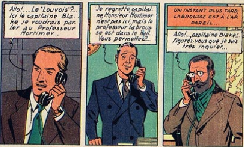 Un peu plus tard il abuse du téléphone du commissaire pour appeler l’Hôtel Louvois et prévenir Mortimer de son retard. Il tombe sur le professeur La brousse qui lui dit que Mortimer a disparu. Blake lui demande de le rejoindre à la D.S.T, sans même avoir demander l'autorisation à Pradier. :p