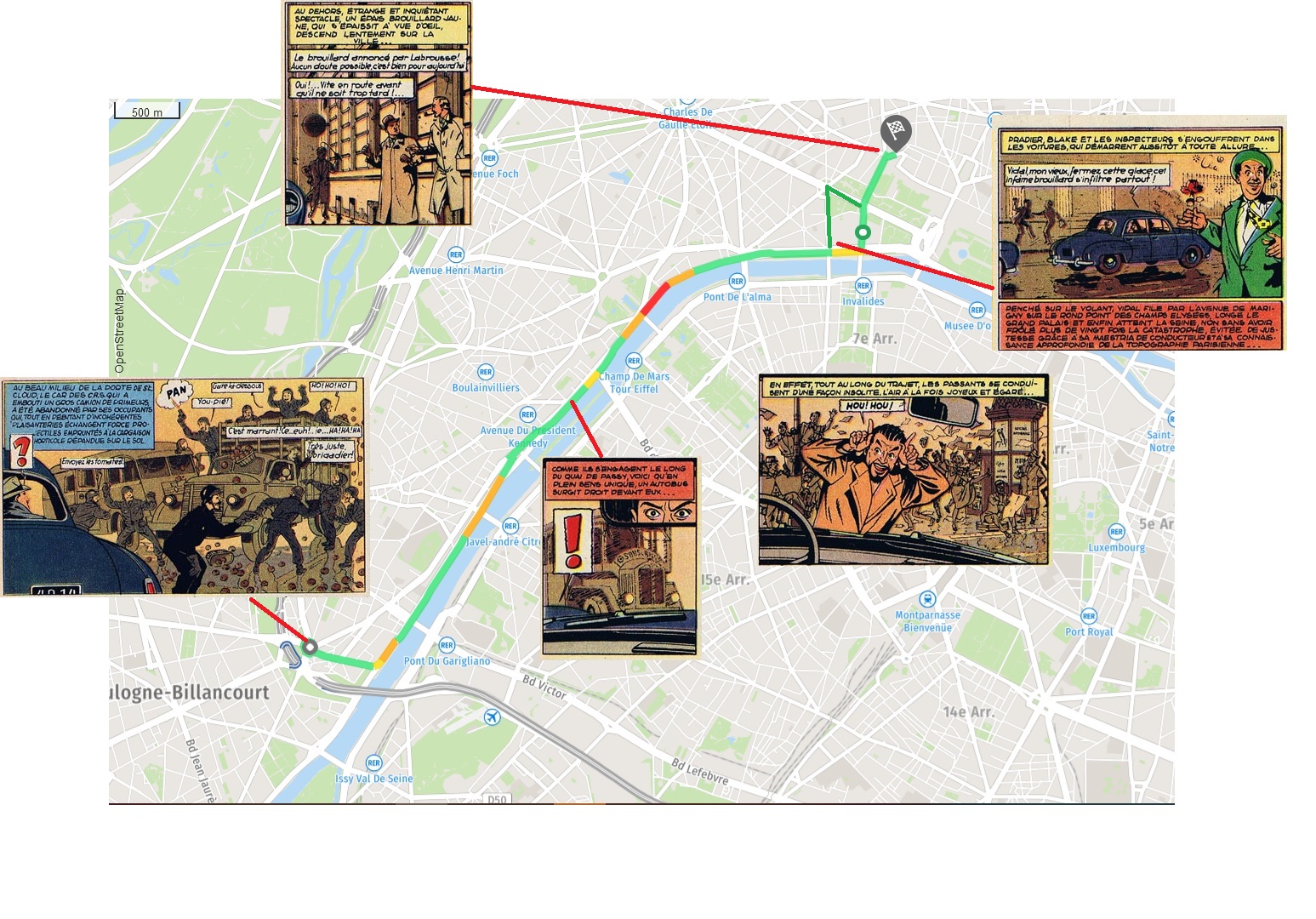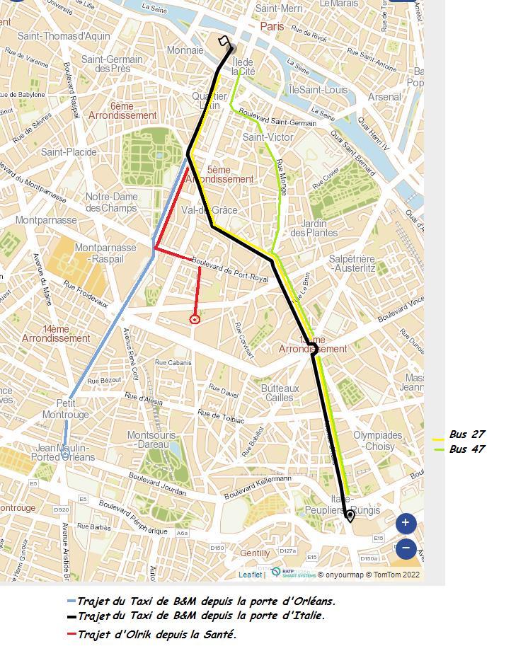 Nous constatons alors qu’à aucun moment, il n’a recoupement entre le trajet d’Olrik et le trajet des deux bus. A moins que le fourgon cellulaire ne soit passé par les Gobelins, pas loin, de son QG(que nous découvrirons plus tard) ?