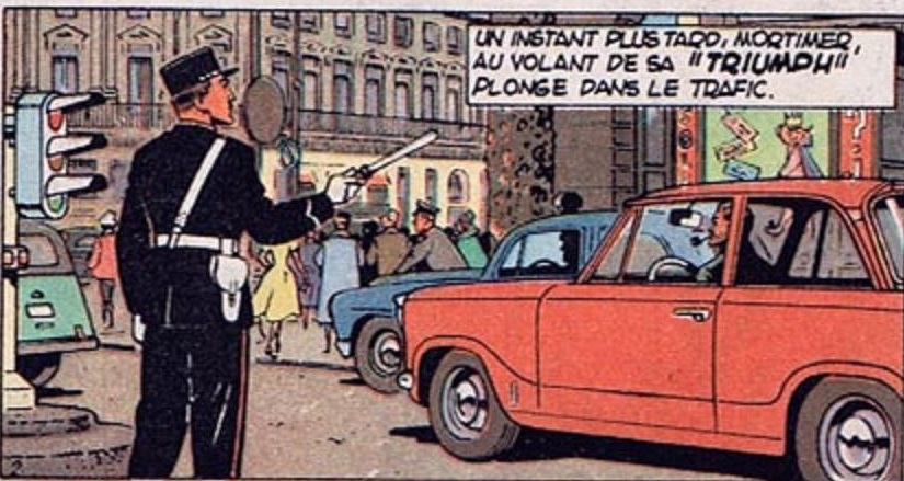 Nous revoyons la rue Berton, lors de la tentative d’enlèvement de Duranton par les sbires d’Olrik (planche 13 à 18). La fuite du tube Citroën est fortement improbable car il aurait fallu prendre en trombe un virage à angle droit dans une rue trop petite pour qu’il puisse s’y frayer un passage.