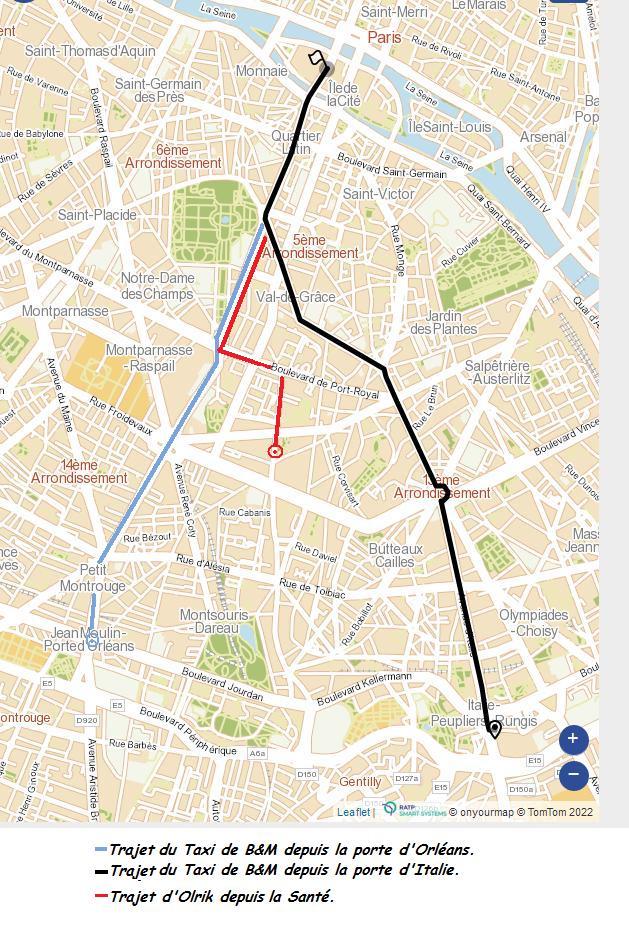 Blake et Mortimer arrivent directement d’Orly, ils sont donc passés soit la porte d’Italie, soit par la porte d’Orléans. Olrik vient de la prison de la Santé. Tous se rendent dans le palais de Justice sur l’île de la Cité.