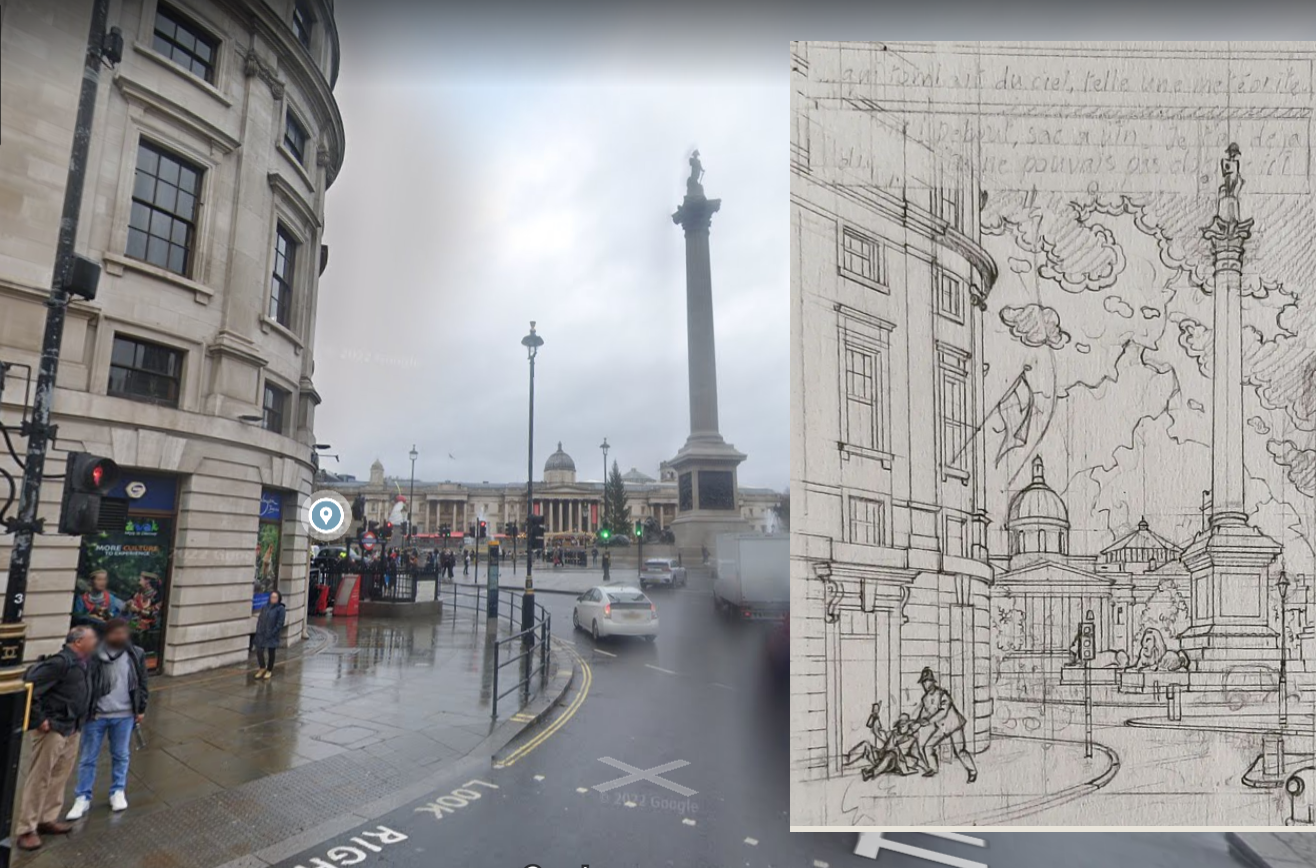 Belle vignette de Trafalgar Place avec la colonne Nelson devant ce qui est de nos jours l'agence de tourisme de Malaisie.
