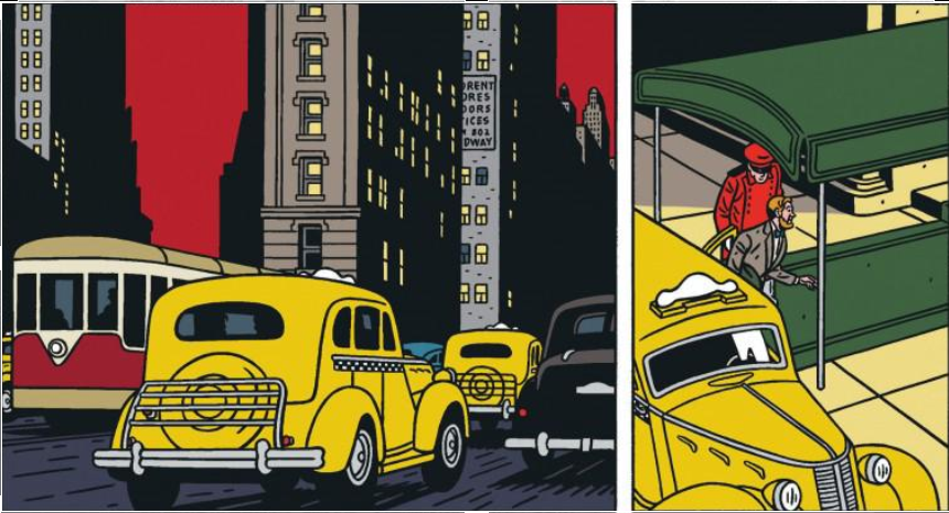 Sur l'autre voie de la West side highway , il y a un cabriolet qui ressemble à la voiture du capitaine Haddock dans les boules de cristal,inspirée d'un cabriolet Lincoln Zephir.