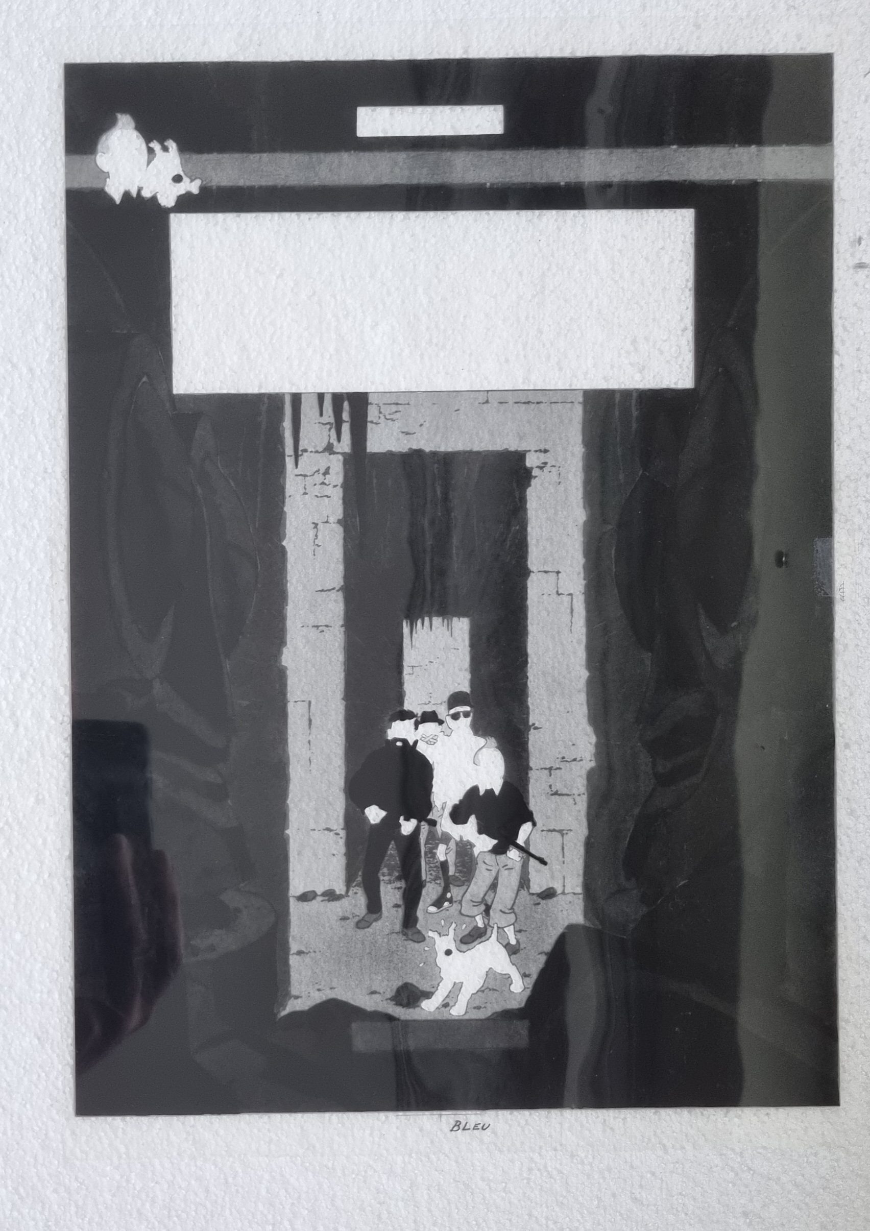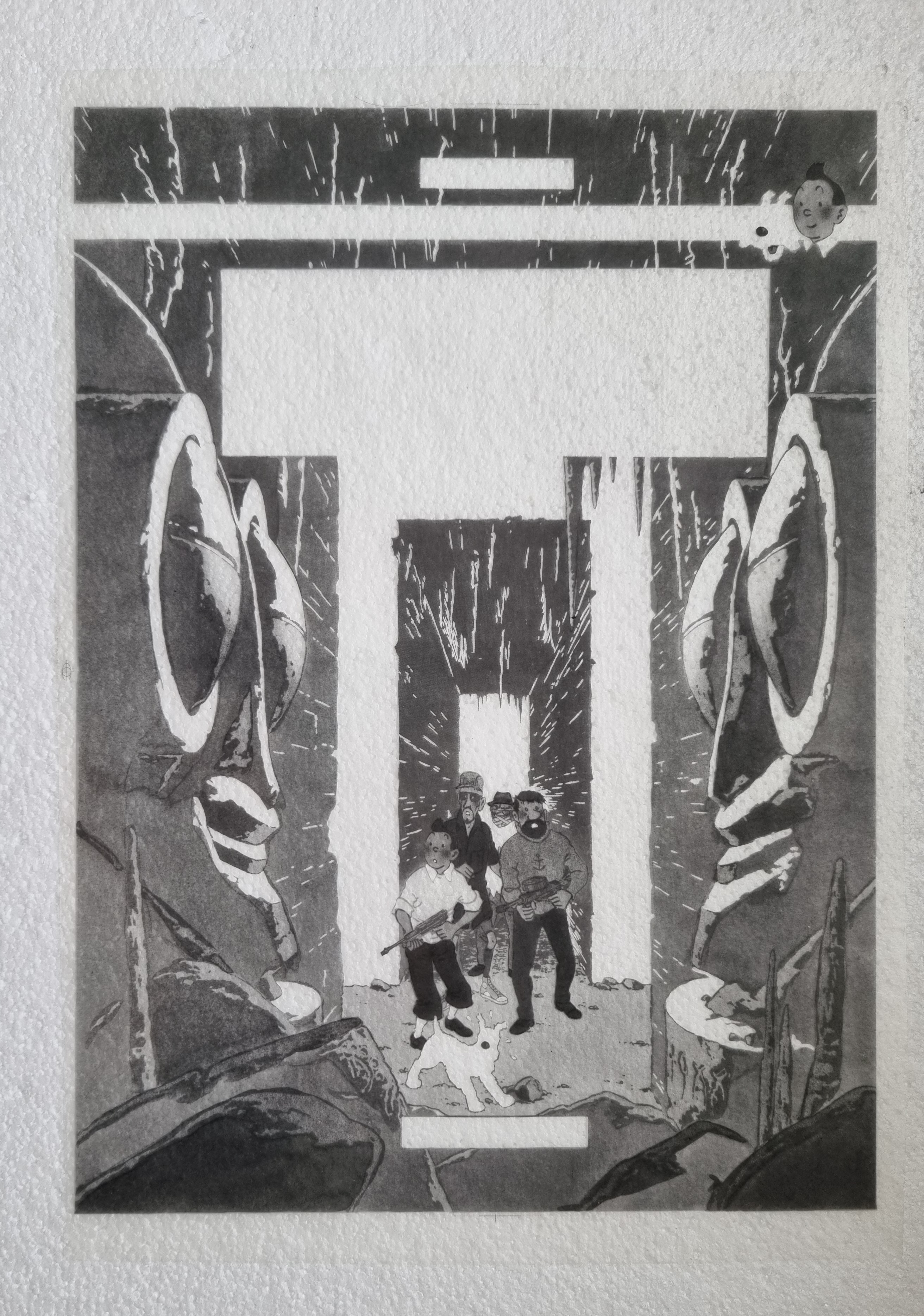 Plaque d'impression en zinc : Double planches offset des planches 36 et 17 (version allemande) : scène où Tintin rencontre le professeur Siclone en train de peindre le signe de Kih-Oskh et sur la partie droite la planche où Tintin retrouve Rastapopoulos en train de réaliser un film.