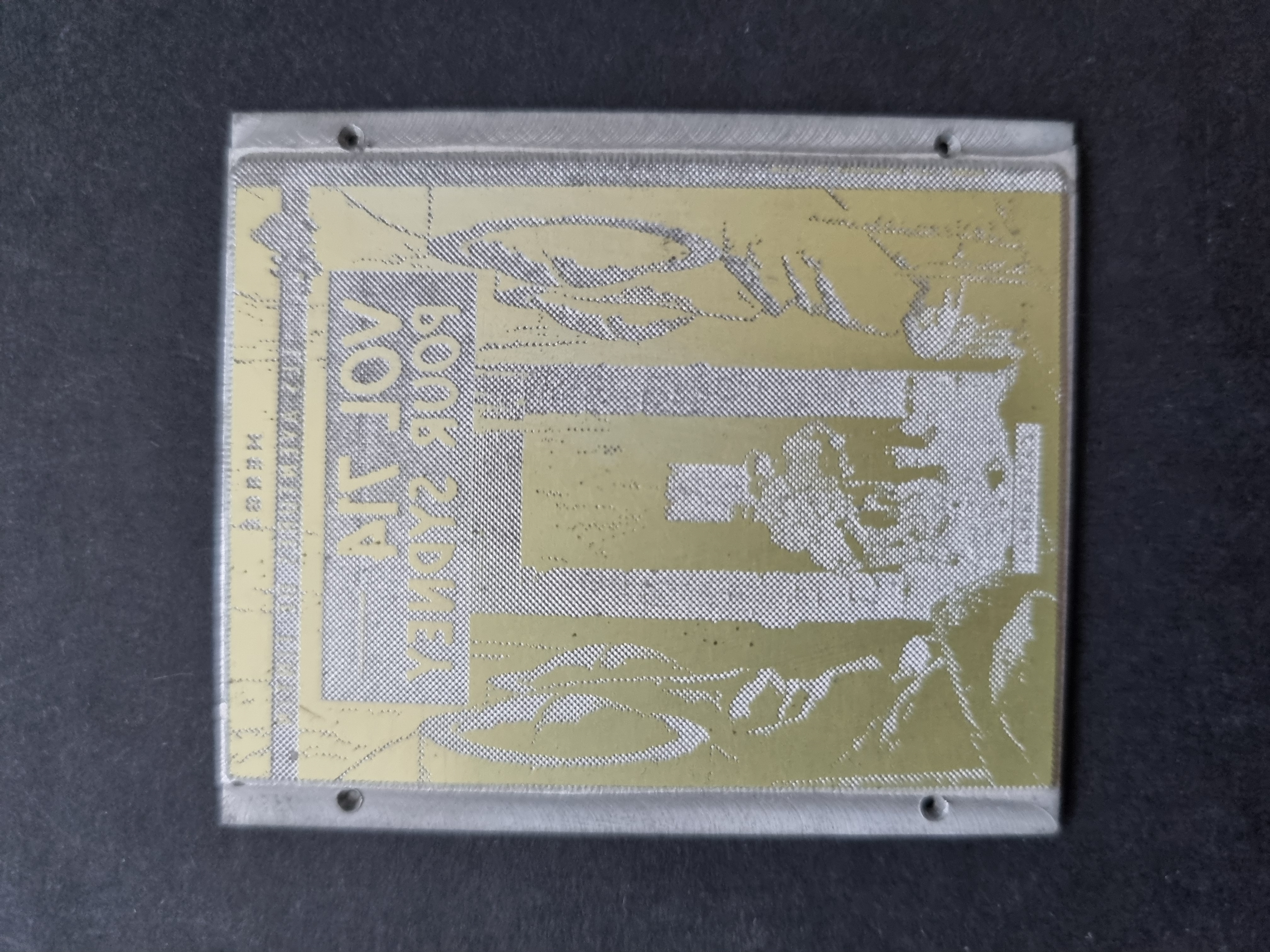 Il s’agit d’un cliché pour tampographie. La plaque en acier gravée sert à réaliser des cadrans de montres. En l’occurrence, ce cliché gravé représente Tintin conduisant une moto. C’est ensuite la réalisation par une technique de « transfert ».