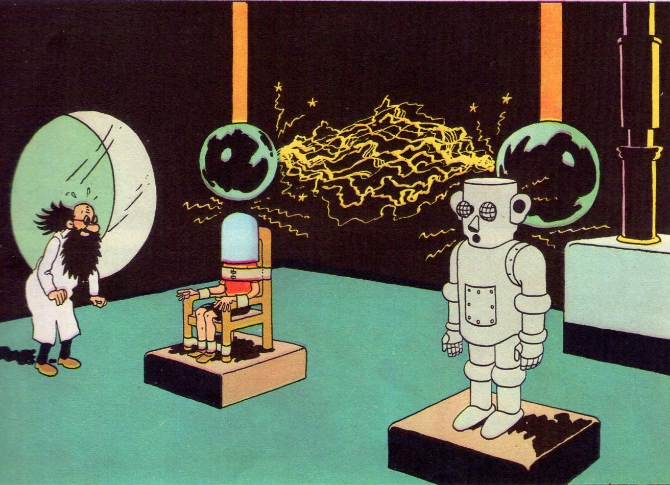 Dans L’éruption du Karamako nous assistons à une scène assez terrifiante où le savant fou essaie de transférer l’âme de Jo ( Guinéa Pig ?) dans un robot qu’il a inventé ! Le jeune lecteur peut facilement imaginer que c’est un transfert irréversible avant de passer fébrilement à la page suivante.